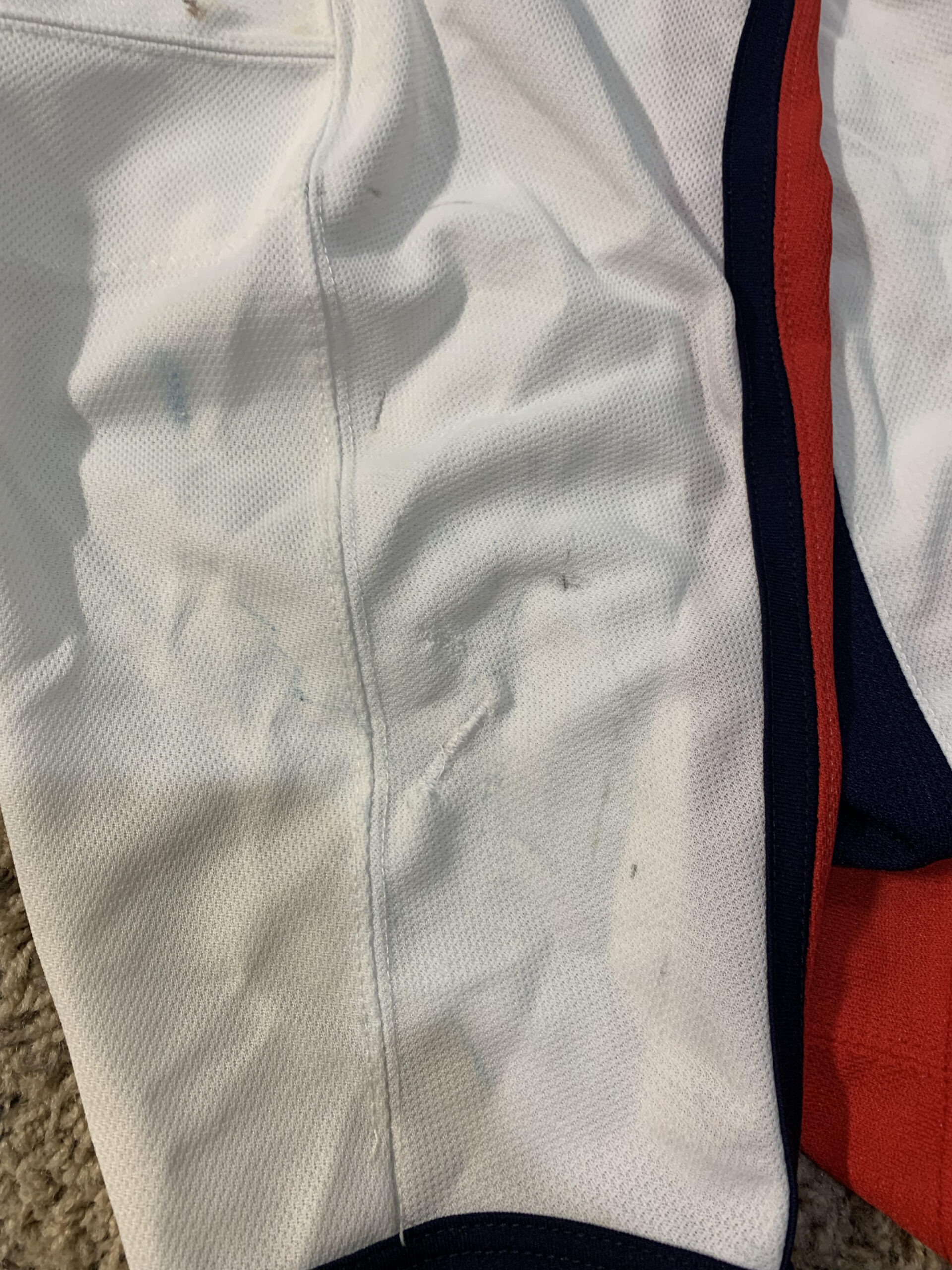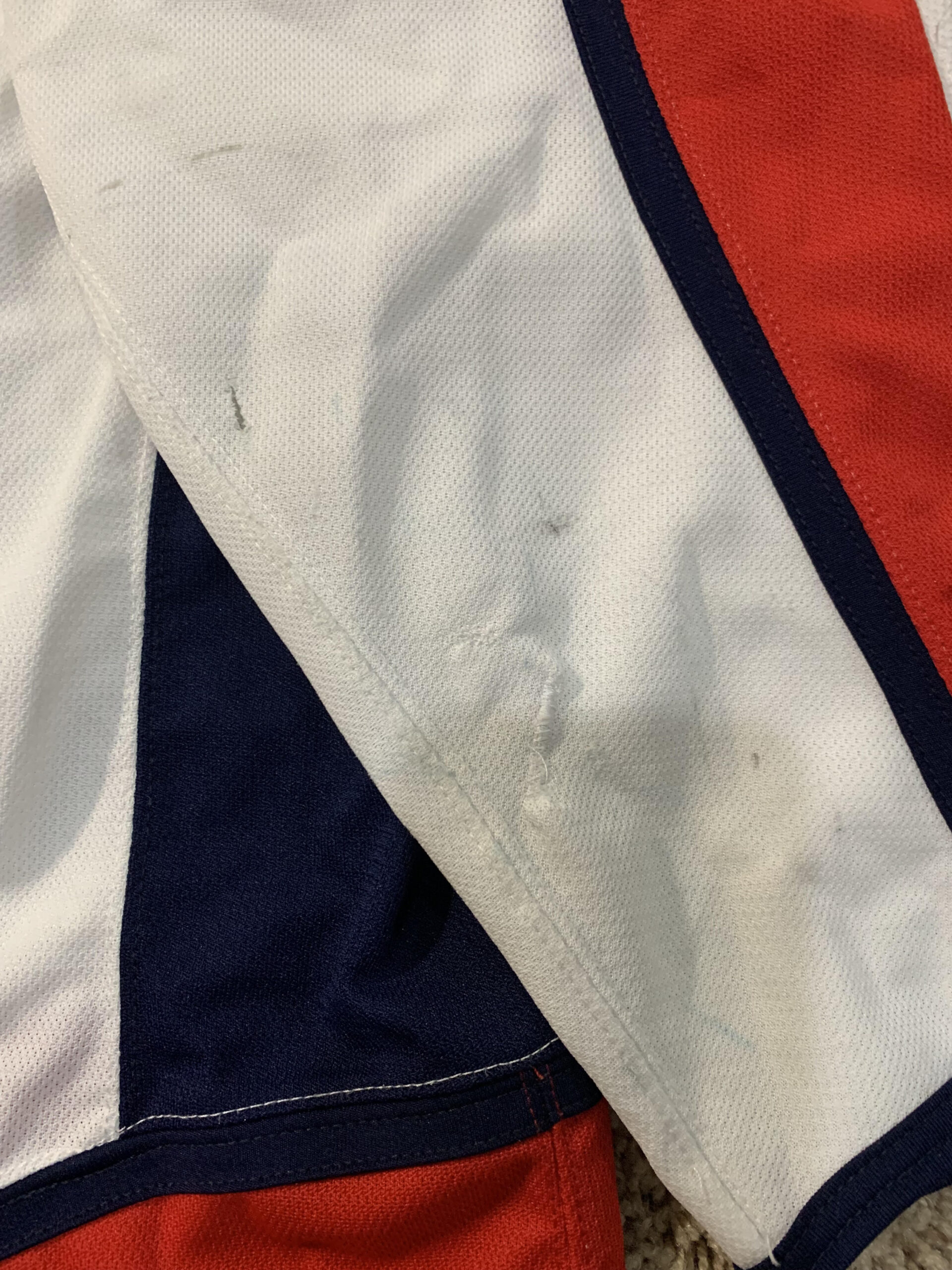 - jersey shows game use with two team sew repairs on each sleeve with board burns and stick/puck marks