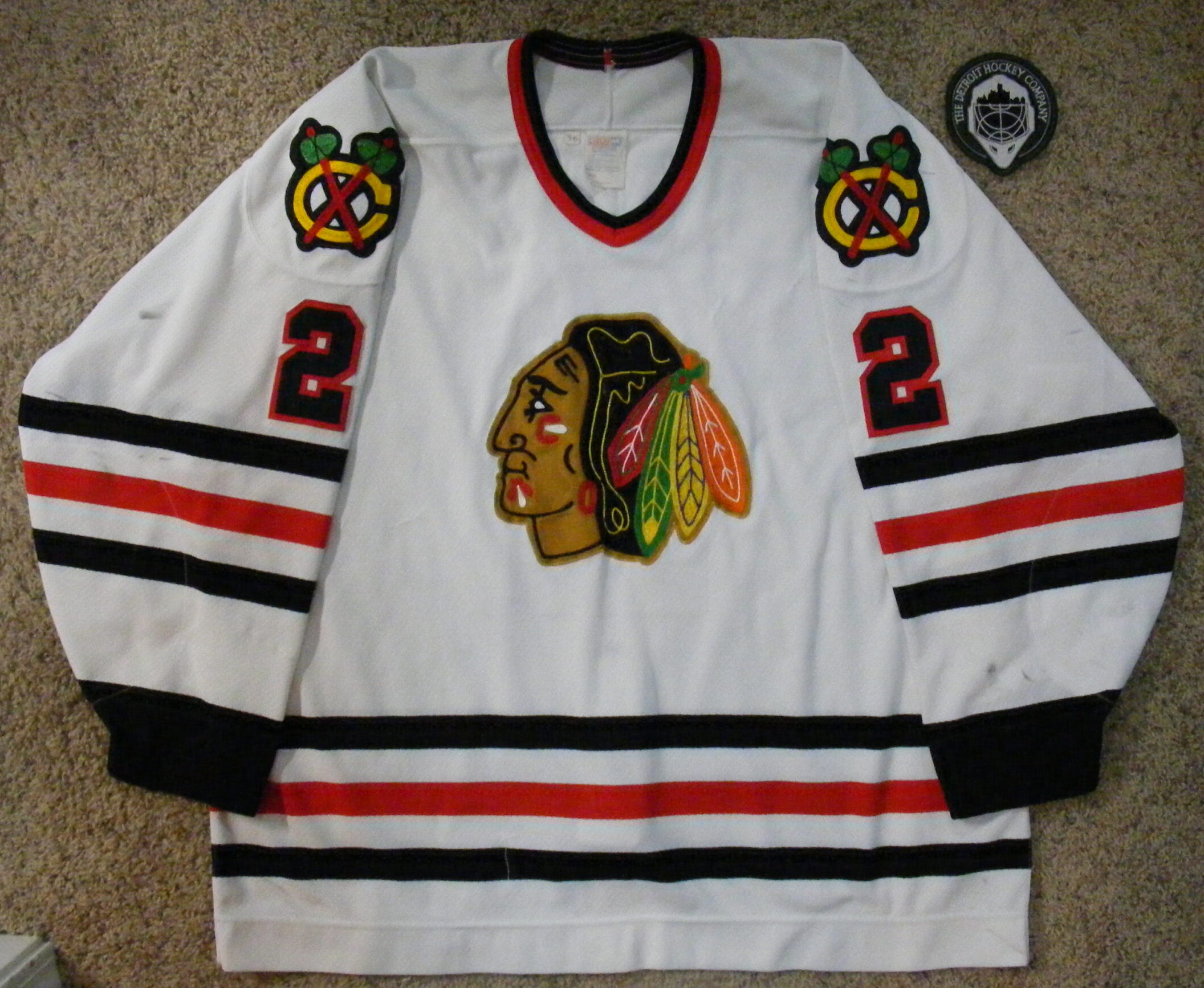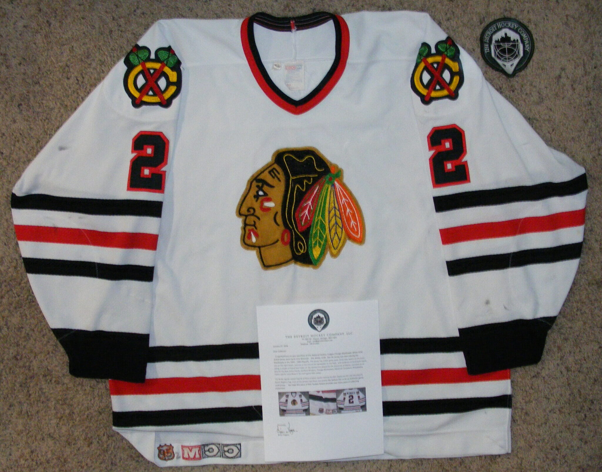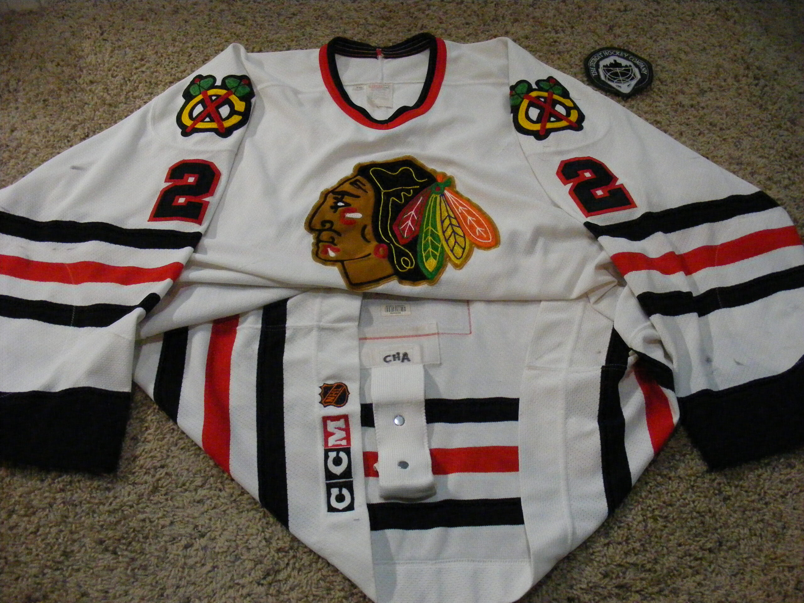 - Three sew repairs on the front body of the jersey, one on the right forearm, one next to the end of the nameplate on the back, some board marks and burns on left sleeve, stick marks on the body and sleeves, see photos