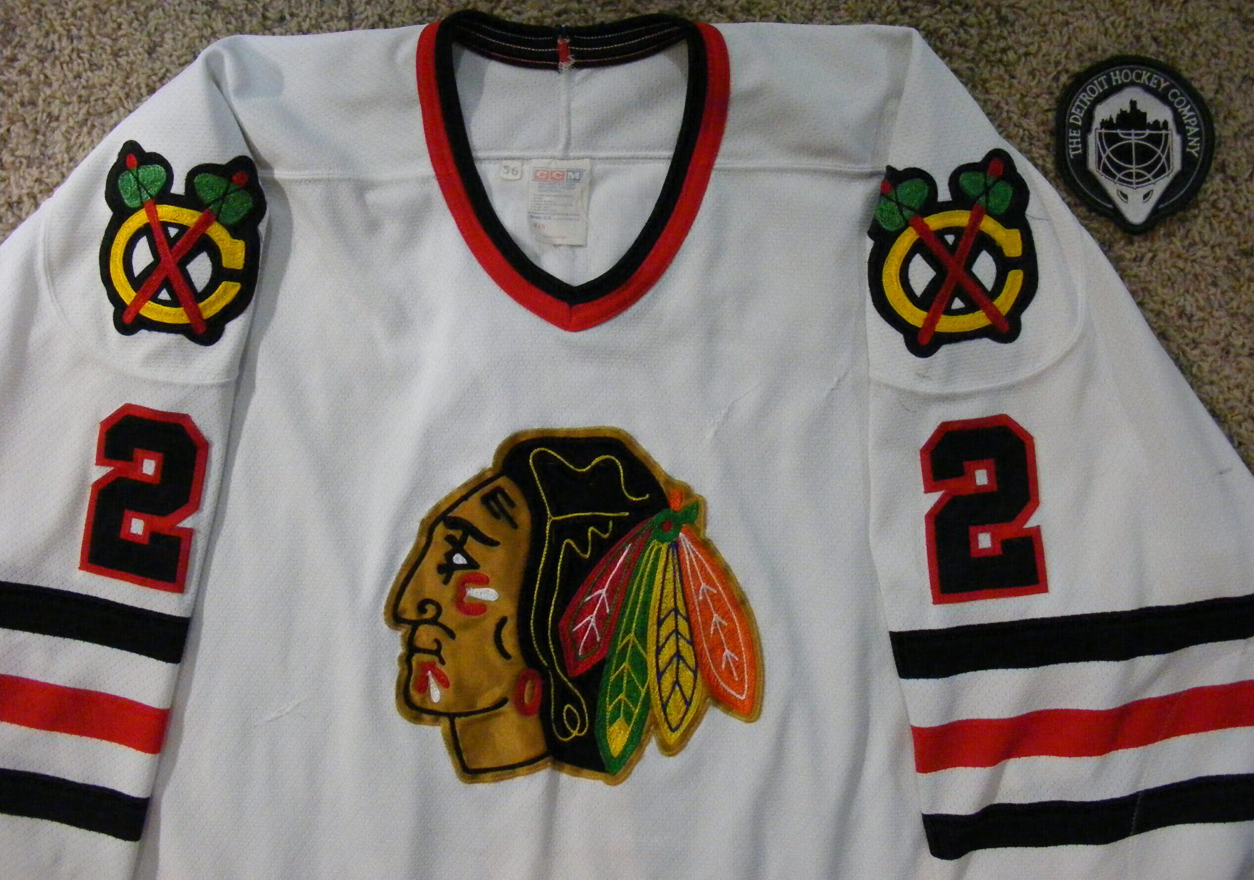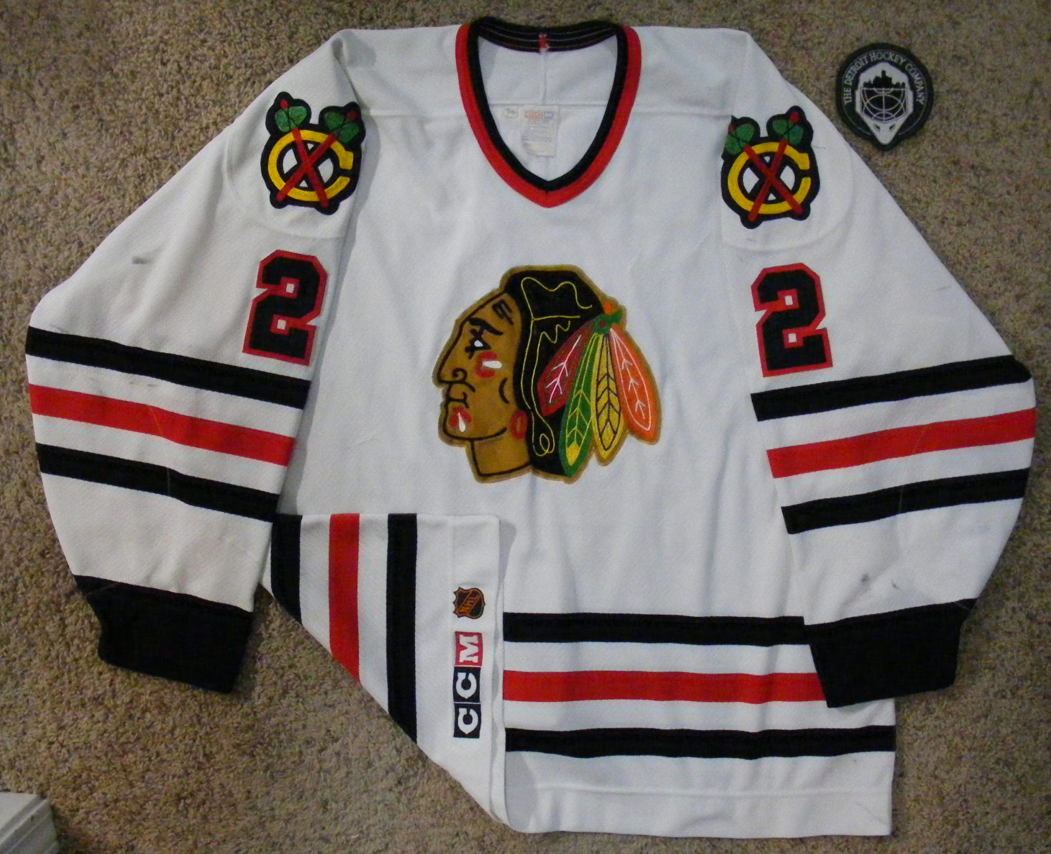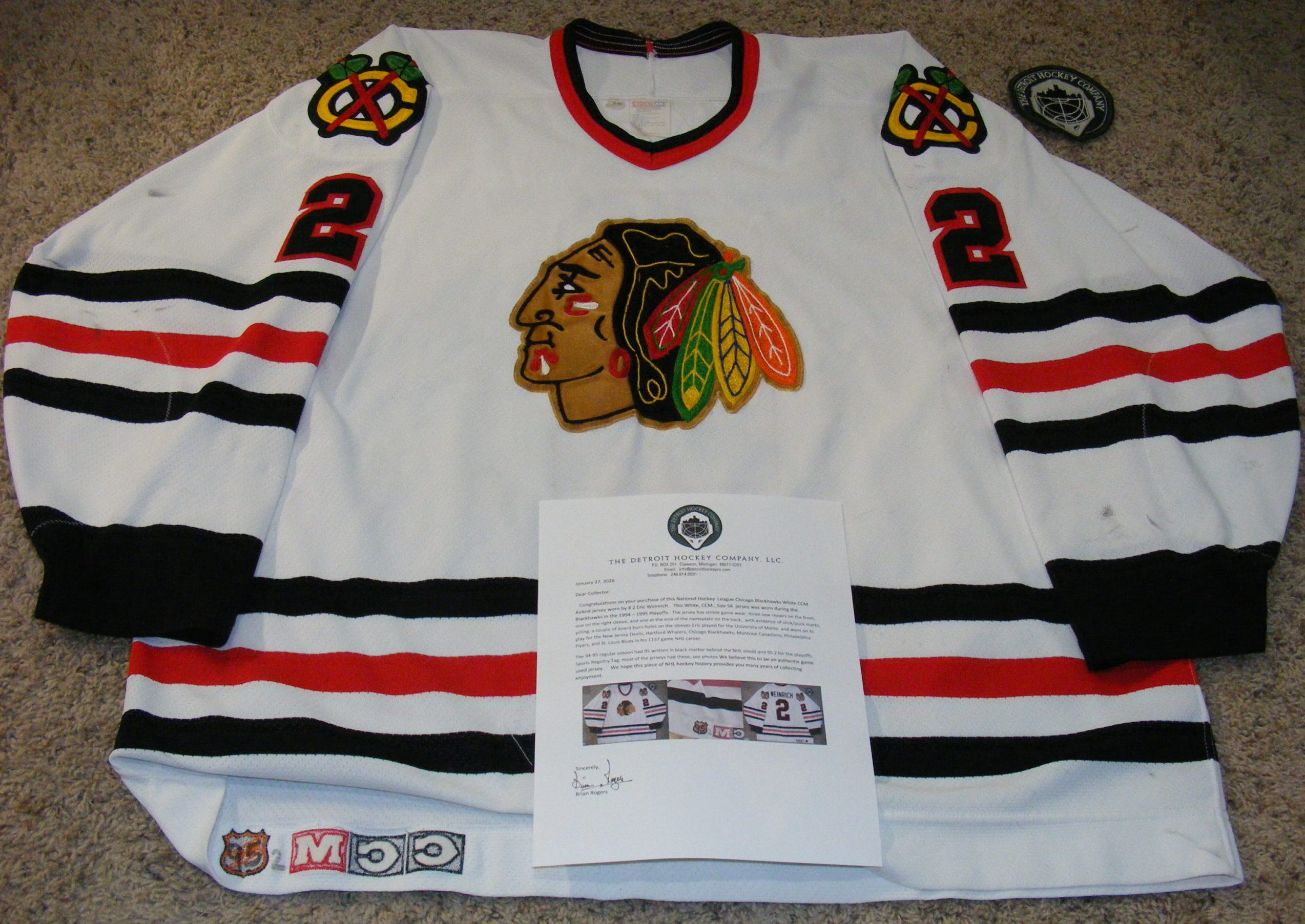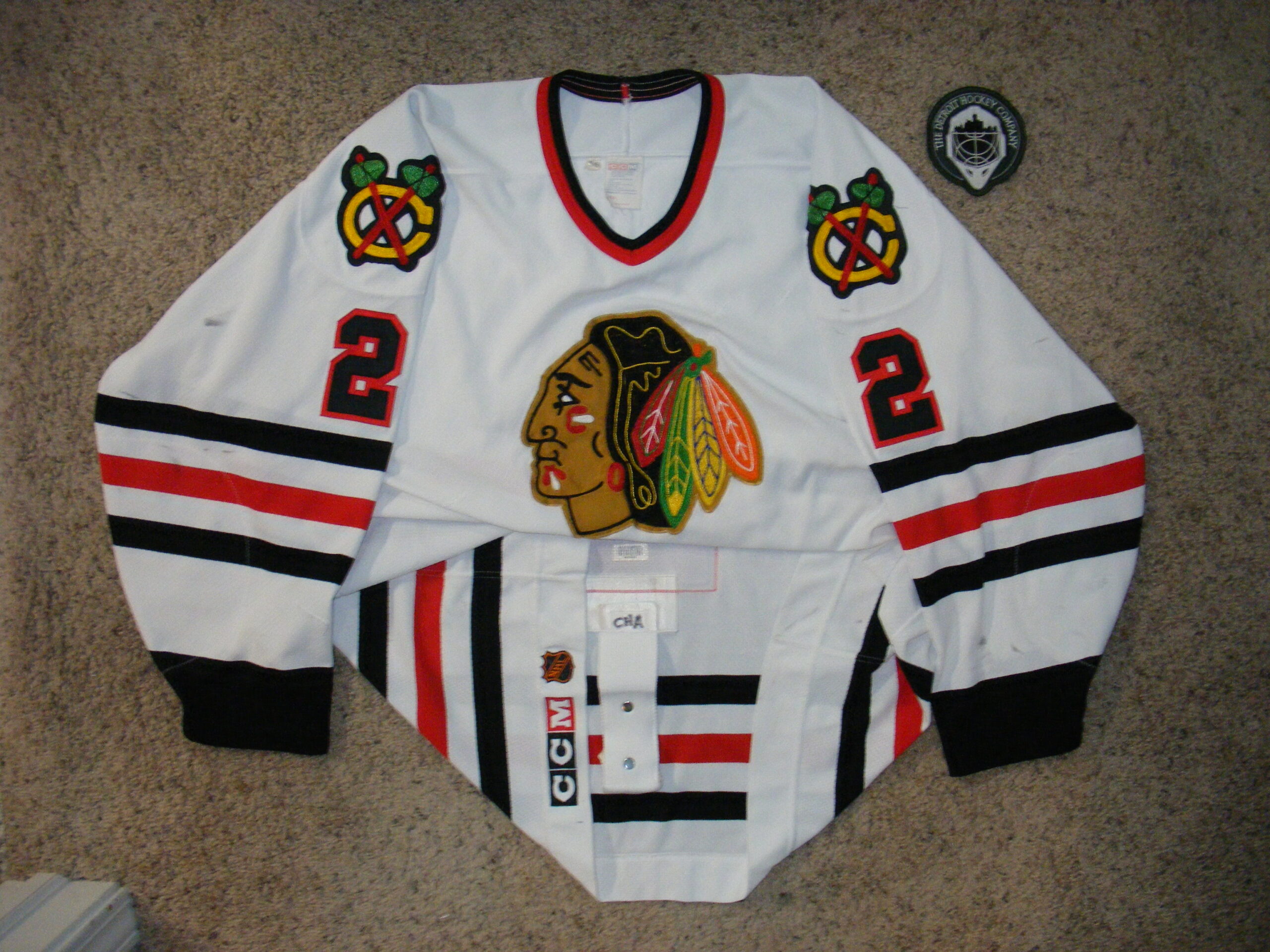 - Three sew repairs on the front body of the jersey, one on the right forearm, one next to the end of the nameplate on the back, some board marks and burns on left sleeve, stick marks on the body and sleeves, see photos